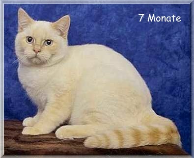 Body colour is an even, pale magnolia. Points have deep markings like a normal tabby cat in dark midnight-blue with patches of light yellow-orange. A 'thumb-mark' of lighter colour in front of the ears. The face should have a blaze of cream (This link shows a Birman - these have mittens, so the points are not visible on the legs).
