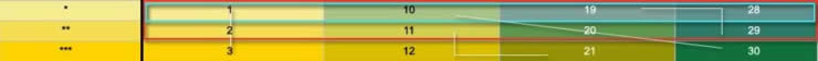 10, 20, 30 - Equal amounts of yellow and blue gives green (pale when both are level 1, medium when both are level 2, and deep when both are level 3)